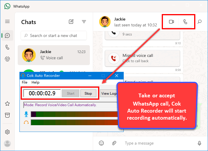 Open WhatsApp on your computer and start a voice or video call as you normally would, or answer an incoming call. The Cok Auto Recorder software will automatically detect the active call and begin recording. You do not need to press any buttons. The recording will automatically stop when either party ends the call.