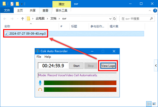 After the call ends, click the "View Logs" button within the Cok Auto Recorder interface. This will open the folder containing all your recordings. You will find the audio file from your recent call, named automatically with the date and time of the recording. Both sides of the conversation will be clearly audible in this single audio file.