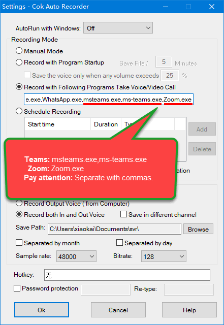 Many people want to record Microsoft Teams and Zoom meetings without others knowing. Luckily, Cok Auto Recorder is a powerful tool that can help you achieve this. With it, participants in the meeting will have no indication that someone is recording. There are no notification on their software interfaces. In addition, you can also set the software to run in hidden mode, there will be no displays on the PC screen, and the computer user will not be aware of the existence of the software.