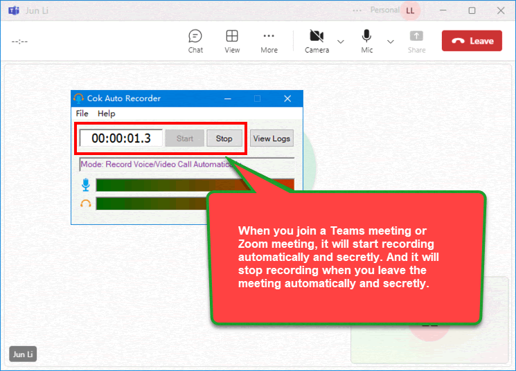 3. When you join a Teams meeting or Zoom meeting, Cok Auto Recorder will start recording automatically and secretly. And will not notify attendees, No one knows that you are recording the meeting content. Of course, you don't need to apply for recording permission from the host either.